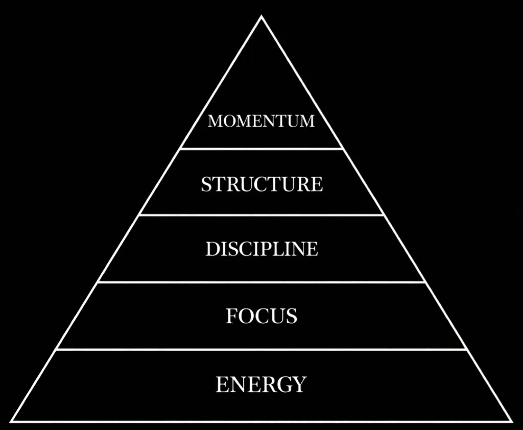 At the top of the pyramid sits momentum. Momentum is the compound result of energy, focus, discipline and structure working together over time. It cannot be forced. It is built through consistent action, clear standards and deliberate execution.